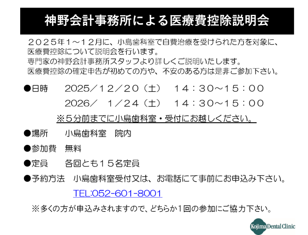 2025年1~12月に、小島歯科室で自費治療を受けられた方を対象に、医療費控除について説明会を行います。