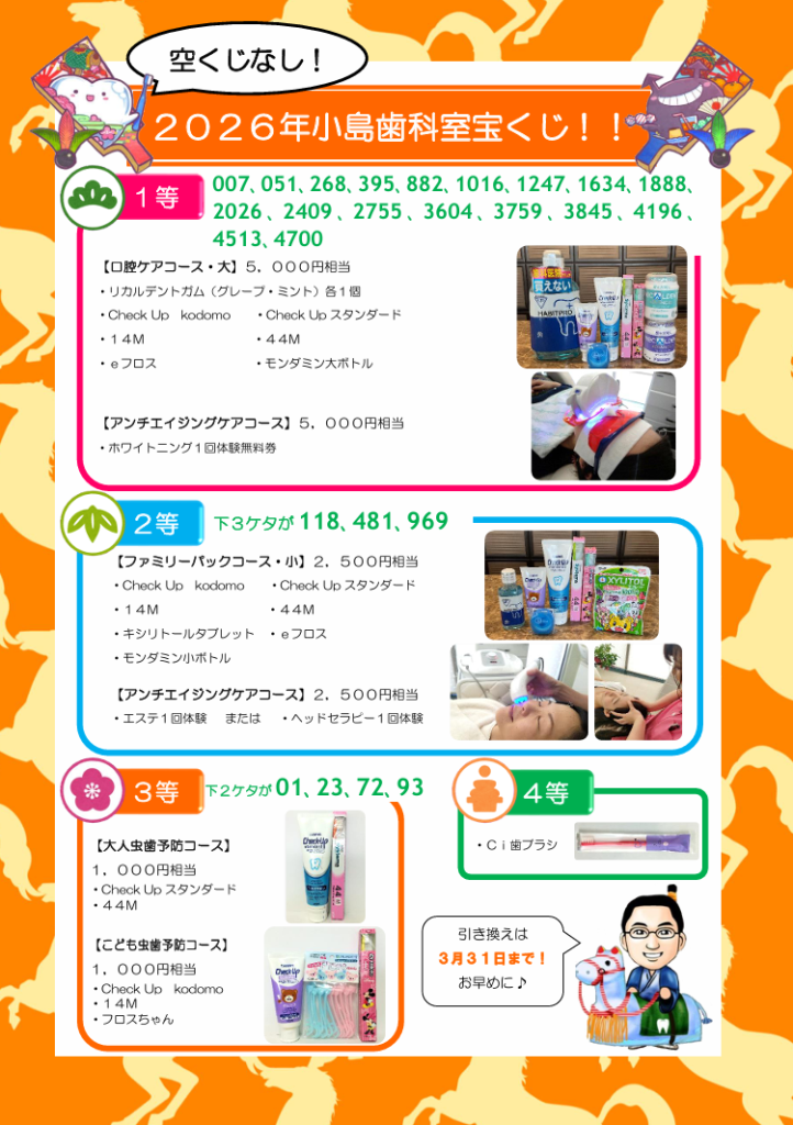 当選番号・景品の内容は小島歯科室・受付でもご確認いただけます。
