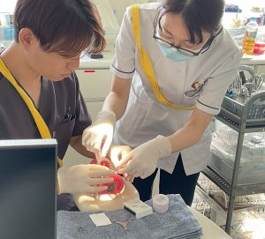 歯科医師は矯正の装置を素早く・的確につけられるよう先輩医師にアドバイスを行いながら練習しました。