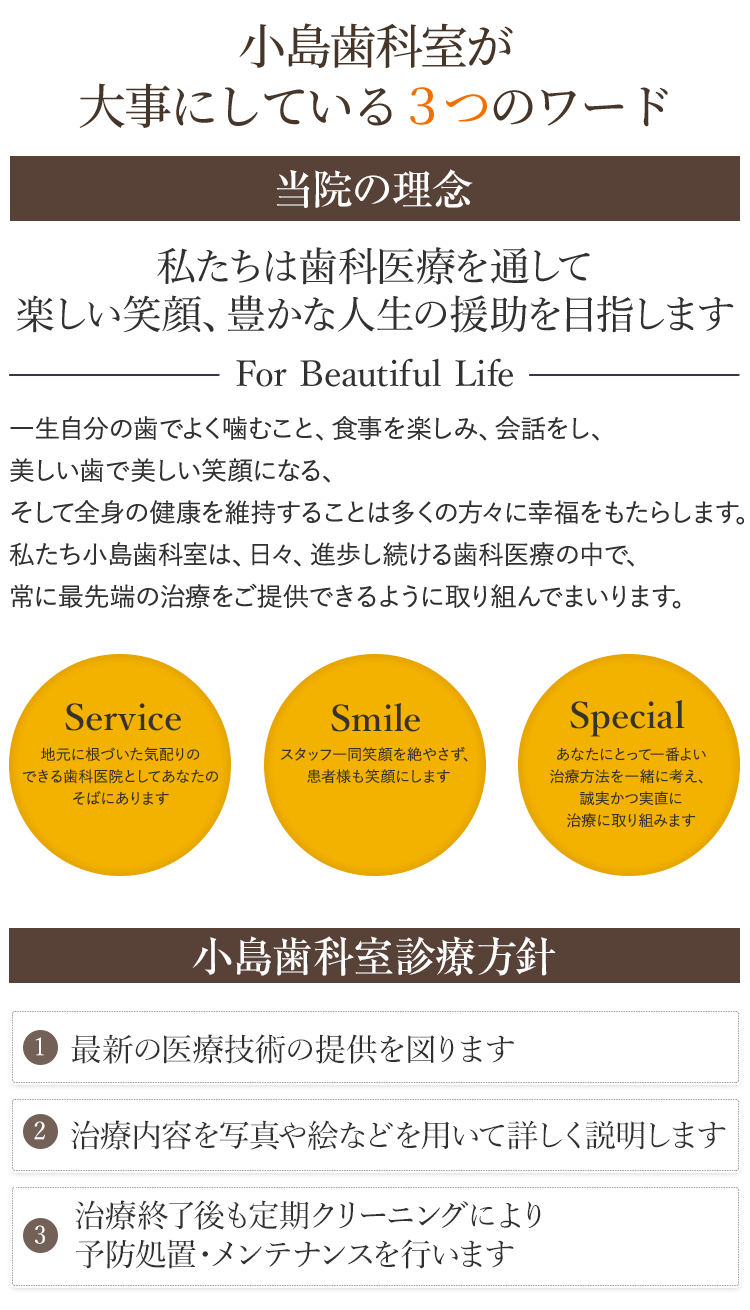 あなたが素敵な笑顔と自分の歯で一生美味しいものを食べられる生活を手にするきっかけに、 私たち「小島歯科室」がなることができれば、とても嬉しいです。